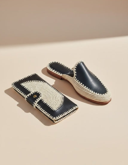 Apportez une touche d’authenticité et de raffinement à votre style avec cet ensemble babouches et pochette entièrement confectionné à la main au Maroc.